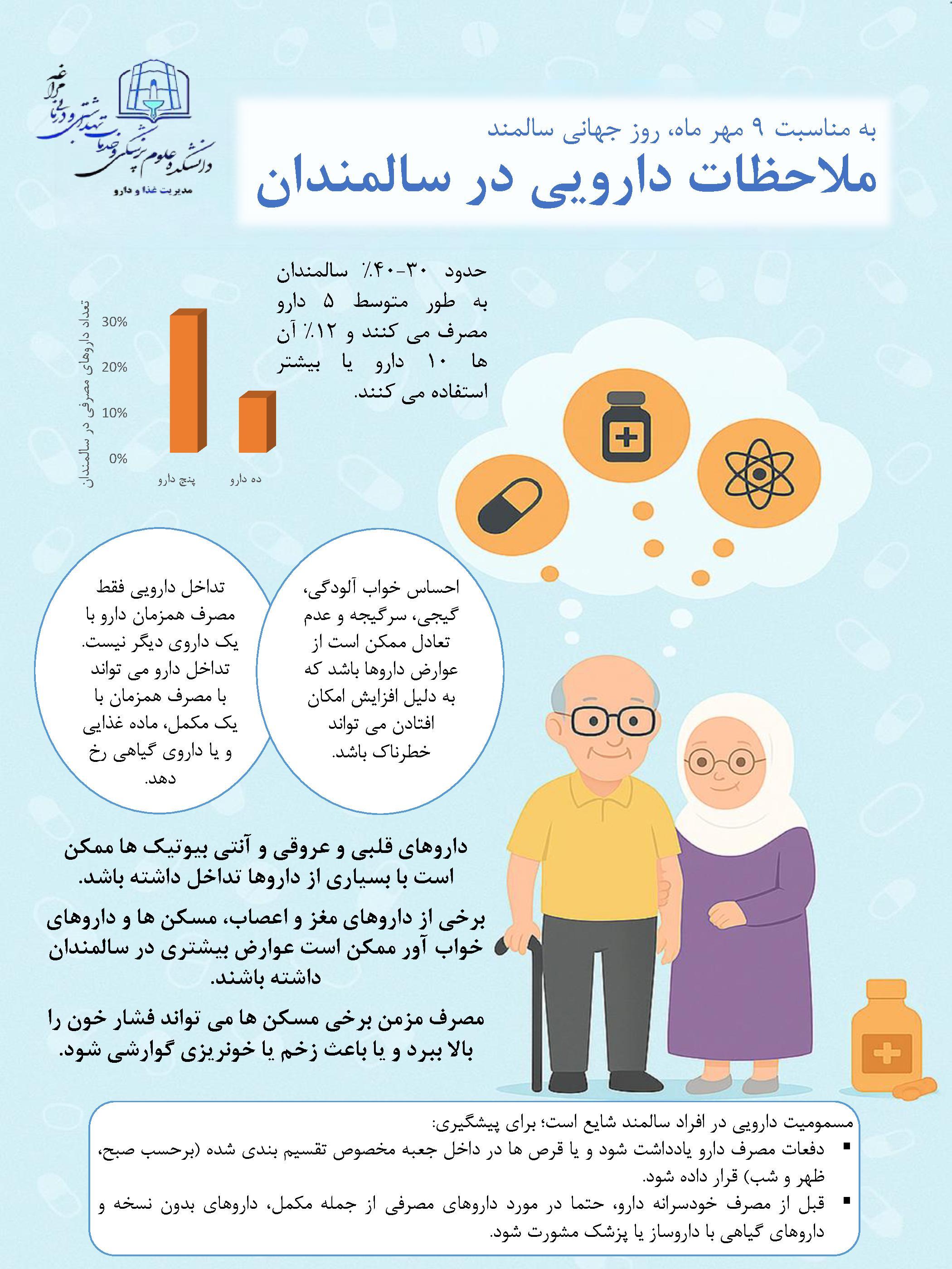 تغیرات ناشی از افزایش سن می تواند بر اثربخشی برخی داروها و عغوارض جانبی اثر بگذارد ازین رو رعایت ملاحضات دارویی در این گروه سنی نقش اساسی در حفظ سلامت و ارتقای کیفیت زندگی سالمندان دارد